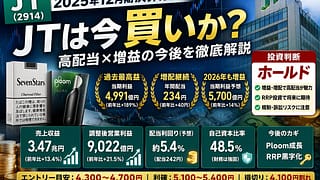 【JT(2914)決算分析】日本たばこ産業は今買いか?2025年12月期決算と2026年見通しから株価・将来性を判断結論投資判断:ホールド(高配当狙いなら押し目買い候補)理由は3つです。2025年12月期は、売上収益3兆4,677億円、調整...